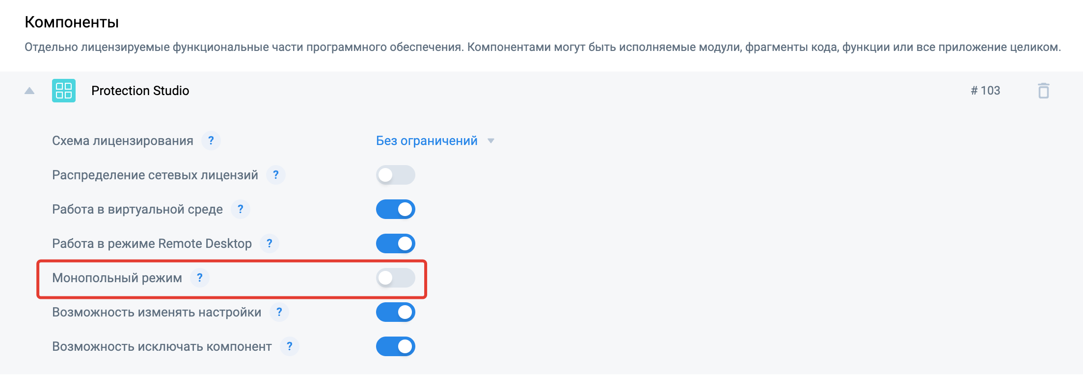 1. Для Компонентов появилась новая настройка «Монопольный режим». Применима только к аппаратным ключам Guardant.